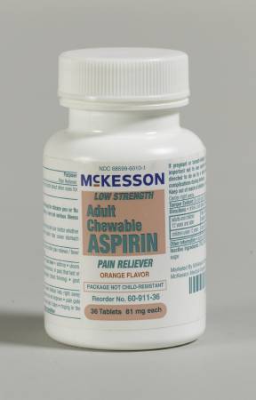 Aspirin Chewable Tablet by McKesson is a low strength, orange-flavored pain relief chewable tablet for adult users. This product is not made with natural rubber latex. Temporarily relieves minor aches and pains. Aspiring may cause allergic reactions such as hives, facial swelling, wheezing and shock.