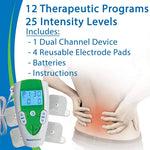 The AccuRelief Dual Cannel TENS Unit provides pain relief through high quality and effective electrotherapy. It comes equipped with everything necessary for TENS therapy, including a remote-control TENS device, 2 lead wires, 4 reusable electrodes, and 3 "AAA" batteries.