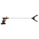 Grabber, adds 32" to arm length to decrease stretching and bending when picking up objects, and ensures user safety. The opposite arm trigger on top of the reacher or grabber allows for use with either left hand or right hand.