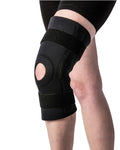 Helps to stabilize collateral ligaments, protect the meniscus and relieve symptoms of mild ostheoarthritis. This open patella, slip-on brace measures 12” (30cm) and features removable metal hinges with an extension stop at 0˚ to help protect knee from hyperextension. High quality neoprene retains natural body heat to help increase circulation and warmth. Superior and inferior straps for compression and support above and below the knee. Bilateral design.