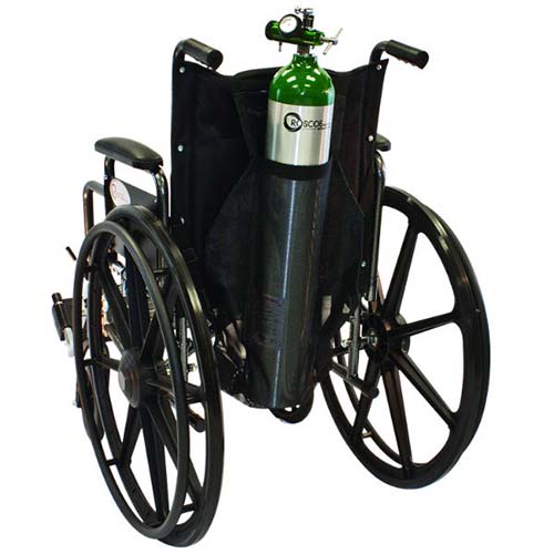 The Oxygen Tank Wheelchair Bag by Roscoe Medical is a nylon mesh cylinder bag for use on a wheelchair.